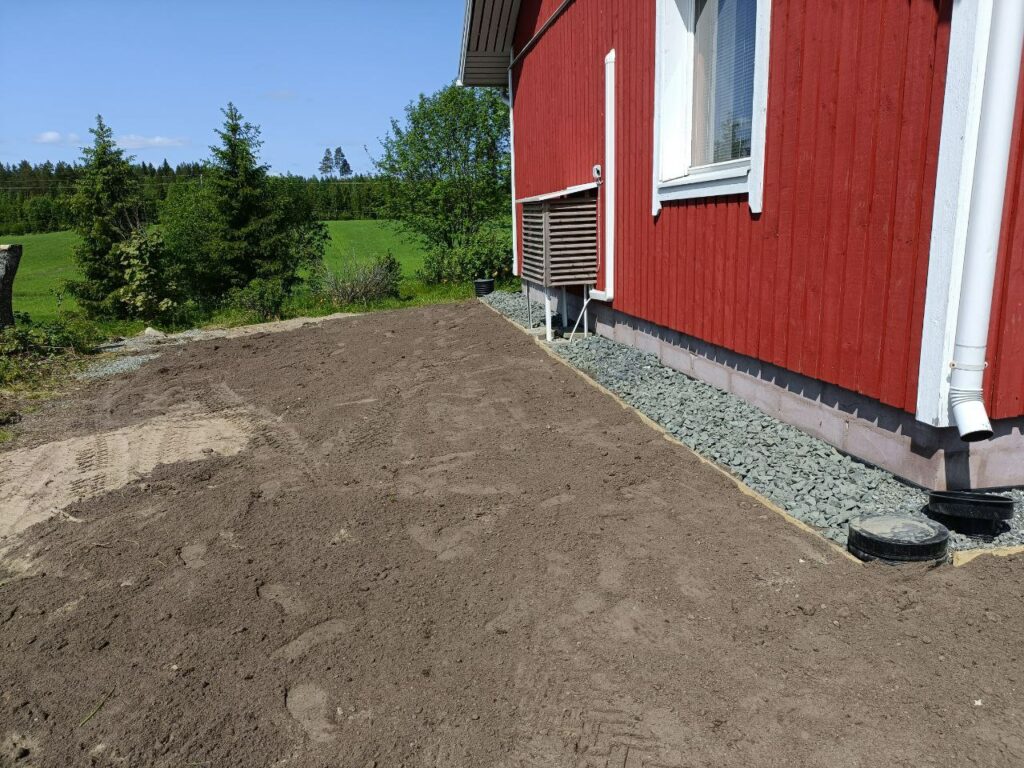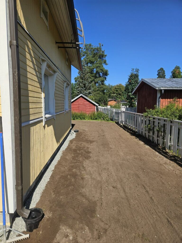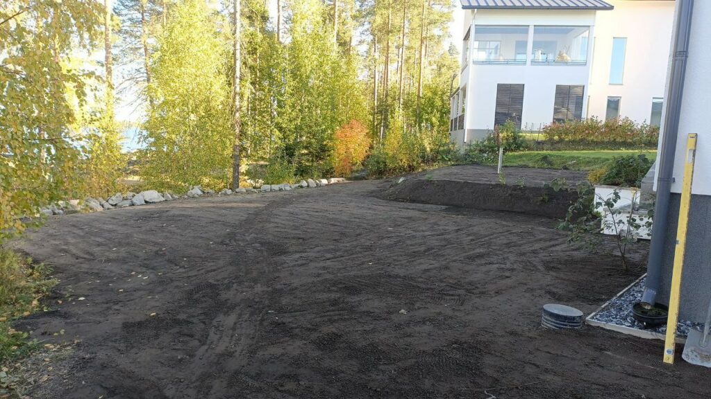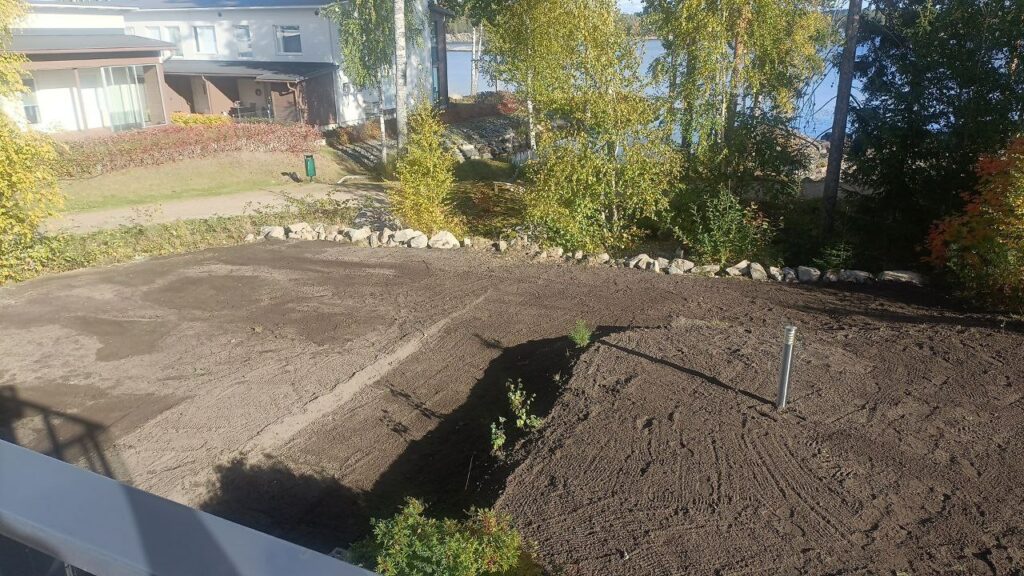 Rakensimme nurmikon pohjat ja suoritimme maan muotoilun kohteessa Suursaarenkierto 28 syksyllä 2024. Saaristokaupungin urakka toteutettiin yhteydenottoa seuraavalla viikolla, ja piha saatiin valmiiksi nurmen kylvölle kauden lopulla.